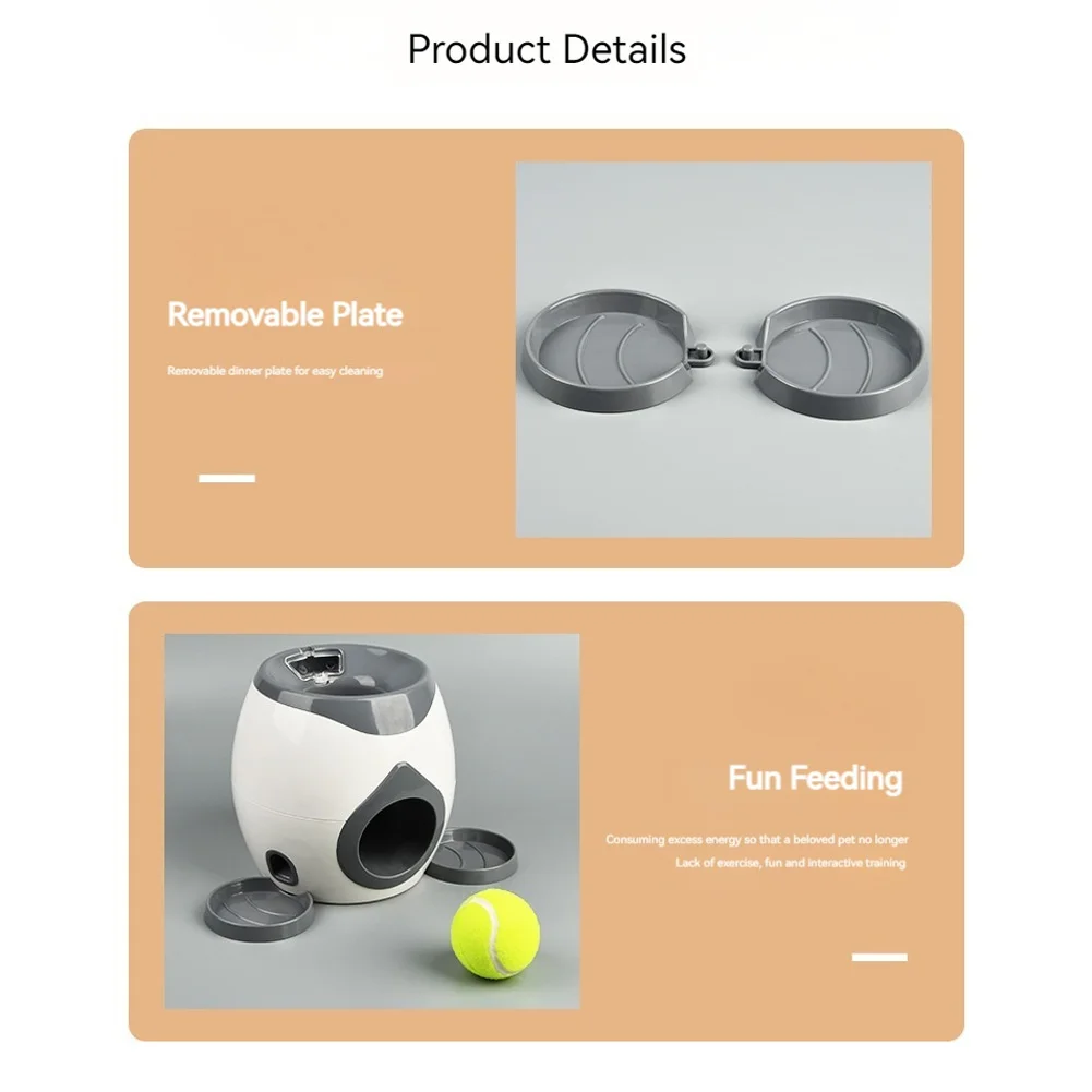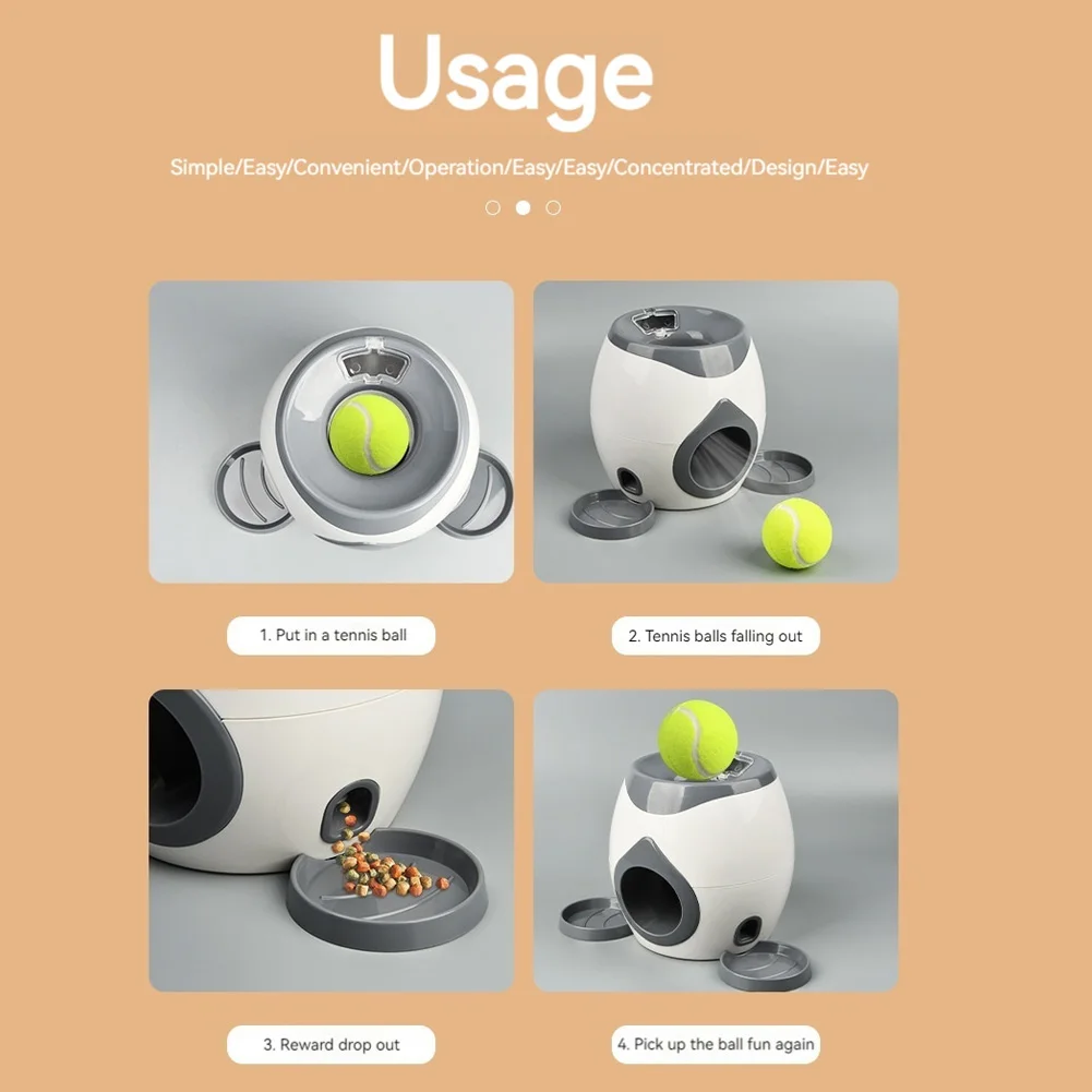 3. Fácil de Usar: Com uma janela de dispensação de petiscos ajustável, basta enchê-la com os petiscos ou ração favoritos do seu animal de estimação e observar a máquina de bolas de tênis para cães liberar petiscos na bandeja quando ativada.