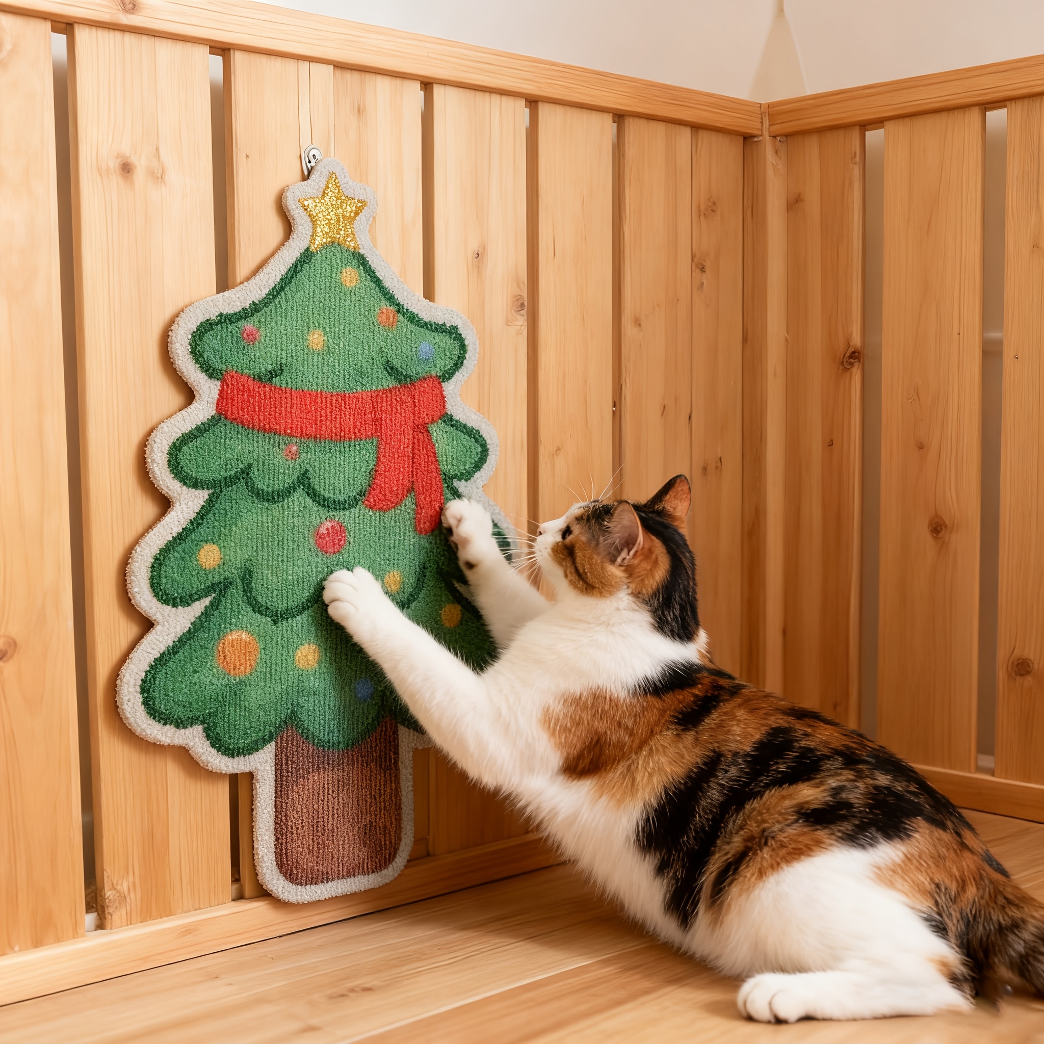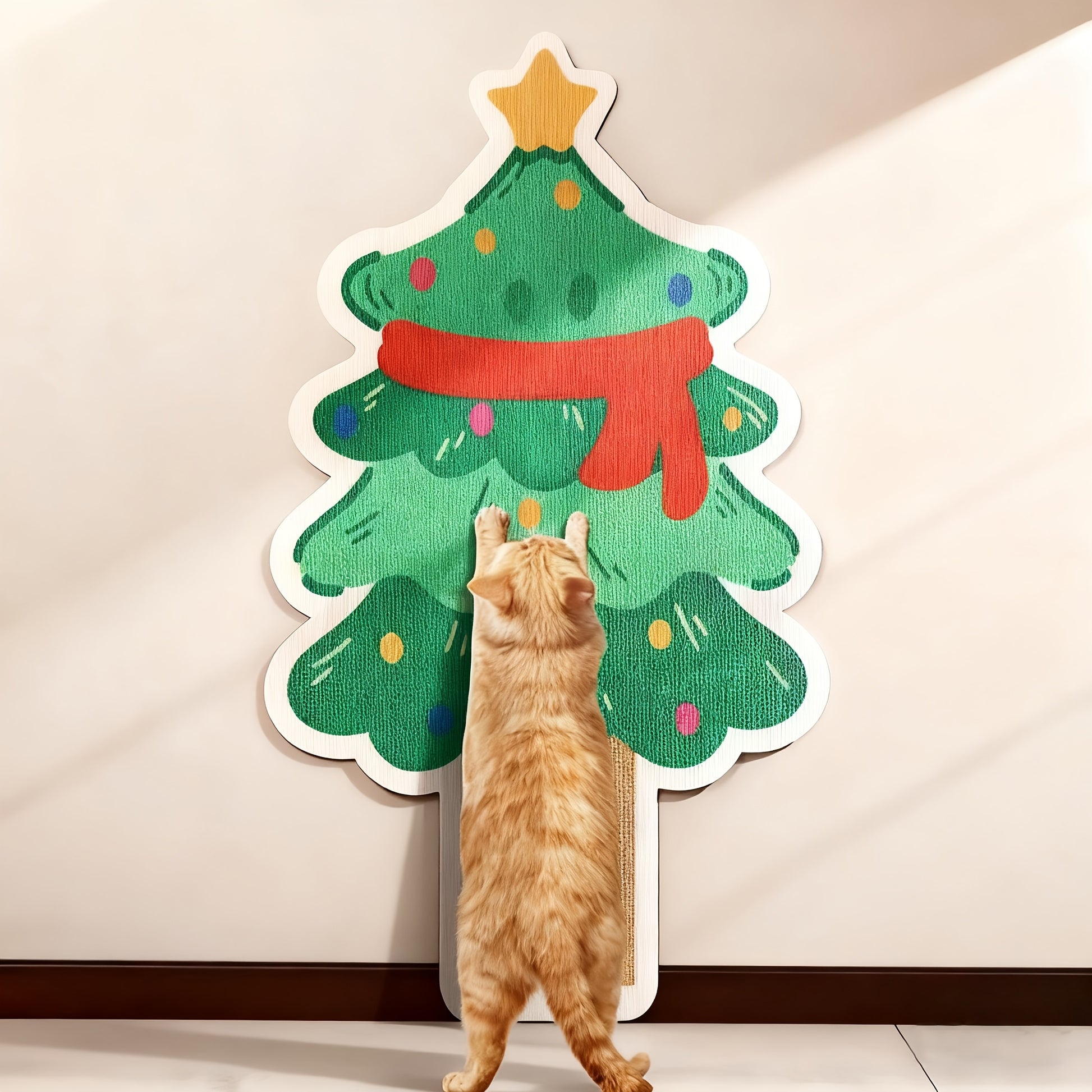 Arranhador para gatos em formato de árvore de Natal, feito com material espesso, durável e que não solta pelos. Ideal para instalação vertical na parede, protegendo o sofá e permitindo que os gatos afiem as garras sem danificá-las. Produto elegante para animais de estimação.