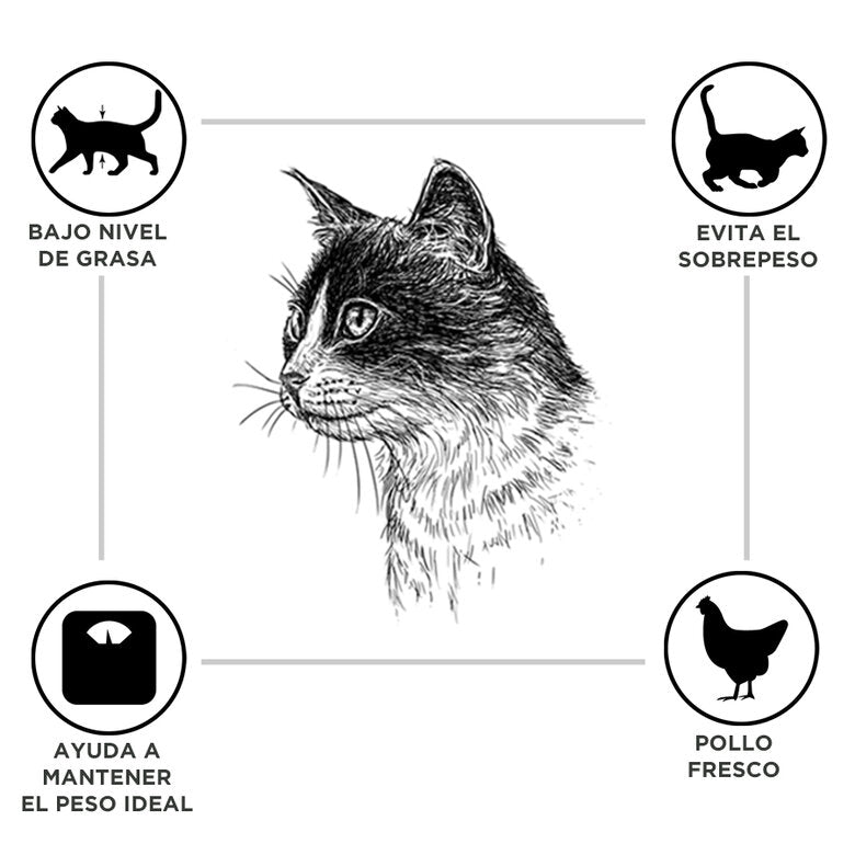 Ração para gatos esterilizados com frango fresco para evitar o aumento de peso e com minerais para evitar infeções do trato urinário ou perda de vitalidade.